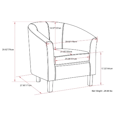 Parker 30 inch Wide Transitional Tub Chair. Size: 29.5″ w x 30″ h x 28.3″ d. Solid wood legs. Handcrafted using kiln-dried engineered and solid woods with high density foam and reinforced seat webbing for extra support, durability and comfort. Simple assembly; just attach legs. . Efforts are made to reproduce accurate colors, variations in color may occur due to computer monitor and photography. The product is warranted to be free from defects in material and workmanship for a period of (1) year from the date of purchase to the original owner.