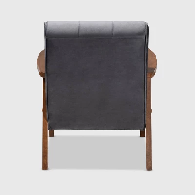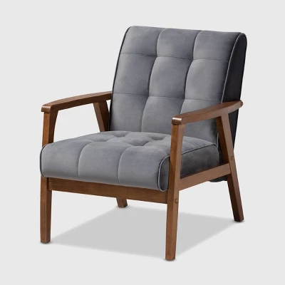 Declare your allegiance to timelessness with the Asta armchair. Constructed from solid rubberwood, the Asta showcases clean lines and a low profile. Soft, sumptuous gray velvet upholstery gives this armchair a distinctive look that pairs well with the walnut brown finish on the wood. Wide, plush cushions provide ample seating comfort, while biscuit tufting and angled legs lend a cool, retro feel. Stylish and versatile, this armchair is well suited for both private living spaces and public reception areas. The Asta armchair is made in Malaysia and requires assembly. Dimensions: 30.51″ High x 25.2″ Wide x 32.28″ Deep; Seating Dimensions: 20.28″ Wide x 20.87″ Deep x 16.34″ High (from Floor); Height (from Floor to Top of Arms): 20.87″ High; Back: 14.17″ High; Legs: 8.27″ High;