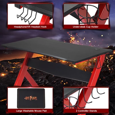 This is our brand new professional gaming desk which is a perfect choice for your enjoyable gaming time! It features large gaming desktop that can withstand 220 lbs of weight, providing ample room for your monitor, PC, laptop, speakers and more.PVC carbon fiber surface is scratch-resistant and easy to clean, reveals excellent performance to allow you to enjoy gaming in enough space. Equipped with a cup holder, a headphone hook and two controller stands, the E-sports table will keep all of your gaming gears organized and be convenient for your daily needs. R-shape frame constructed with steel pipes ensure the stability and durability of the table, accompanying you to enjoy your time in playing games. Good in quality and comfortable for usage, the gaming desk is really worth buying!