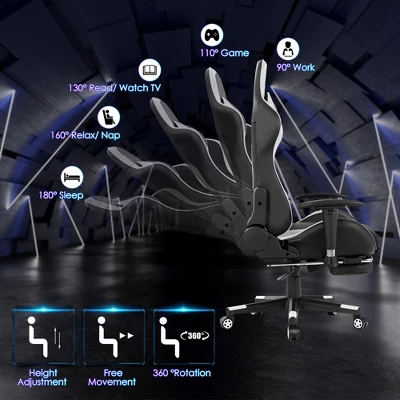 Our gaming desk and chair set is designed to provide you with the perfect gaming experience!Crafted of high-quality materials, our gaming desk and chair set is sturdy and durable for long-term use. The monitor shelf adds more space for the computer monitor and keeps it level with the eyes to relieve cervical and neck pain. With the 48” x 23.5” desktop, you have a spacious area to keep your game equipment and other supplies. Along with the desk, this gaming chair is equipped with adjustable backrest, which allows you to find the best angle for gaming, working and napping. Skin-friendly PVC leather and high-density sponge offer you a soft and comfortable sitting feeling.