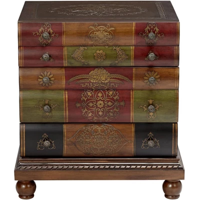 Classic and playful, this fancy traditional 3-drawer end table is deceiving. With a hand-painted chestnut finish with golden accents with embossed book details , this table has a bold design that is sure to stand out wherever it goes.