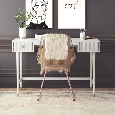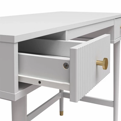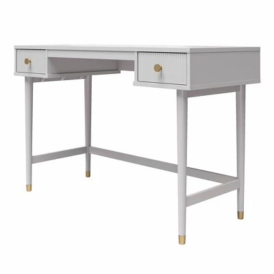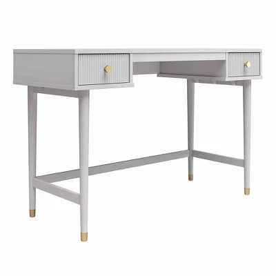 CosmoLiving by Cosmopolitan brings you a truly Pinterest-worthy bedroom ensemble with the lavish, lux Elizabeth Collection. The contemporary chic design of the Elizabeth Desk melds perfectly with midcentury modern contours to create an instant focal point in any room. Fabulously designed with 2 ribbed, textured drawer fronts and adorned with glam gold drawer pulls. The 2 roomy drawers, painted in a creamy dove gray finish, are perfect for tucking away sparkly gel pens, reading materials, or a journal to achieve an organized workspace. Constructed from durable painted MDF, the Elizabeth Desk beautifully sits atop tapered solid wood legs, nestled in gold capped feet, creating a sophisticated and polished look, fit for a modern-day queen like yourself.