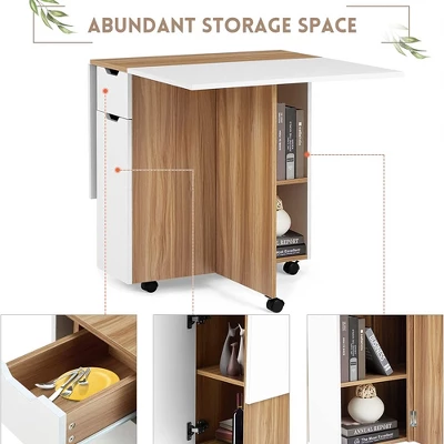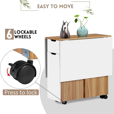 With its convertible design, the JOMEED Folding Dining Kitchen Table with Drawer and 2-Layer Storage Shelf is a great option for apartment living and entertaining alike. This foldable table is designed to bring storage options and make full use of limited space, suitable for apartments, kitchens, dorms, or other small areas. Place this piece in your dining room, or use the convertible table in the living room as a serving station during holidays or other large gatherings. Made of durable particleboard, it can be adjusted according to your needs to be fully open, half-open, or fully folded down for storage purposes. The 6 flexible, wear-resistant wheels can rotate 360 degrees and are equipped with locking brakes, for safe portability from room to room. The table features 2 hidden open shelves and a drawer with a convenient handle, which can be used as additional storage for tableware, linens, bowls of fruit, and other items, to help keep your living area uncluttered. All hardware and instructions needed for easy assembly are included. With its modern look and durable particleboard construction, save space in style for years to come with the JOMEED Folding Dining Kitchen Table with Drawer and 2-Layer Storage Shelf.