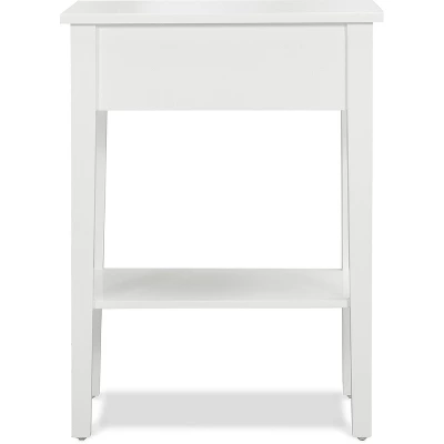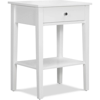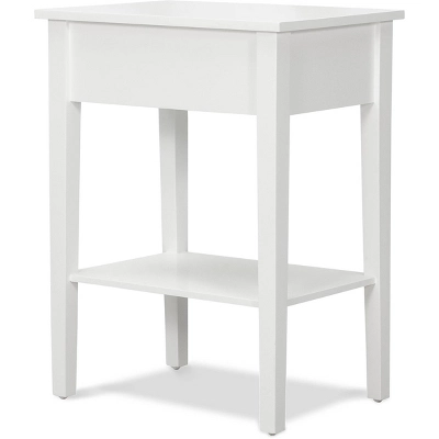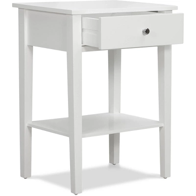 Perfect for displaying family photos or keeping your magazines organized, this end table is a stylish addition to any living room. In a graceful classic design that transcends home décor trends. Available in a charming white finish that complements most decor schemes. The timeless tapered wood legs of this design will never go out of style. The square table top, lower shelf, and storage drawer provide ample space for your favorite decor.