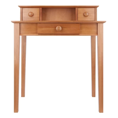 The Studio Writing Desk with Hutch from Winsome is a must-have for your home office or workspace. This honey wood office desk has a built-in hutch with two drawers and a middle compartment for storing and displaying small items. It also features one drawer just underneath the surface where you can easily keep writing utensils, paperwork and other supplies. Small drawer dims 5.51″W x 4.21″D x 4.45″H, Main drawer dims 11.89″W x 11.69″D x 2.44″H. Mix and match with the rest of the studio home office line.